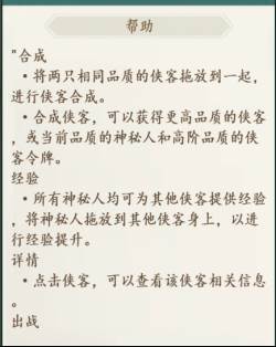 在玩家解锁侠客系统之后,玩家可以通过找下方的三种方式招募侠客,不同的招募方式获得的侠客品质也不同,玩家可以查看该玩法的帮助系统了解更多玩法,在解锁新侠客之后图鉴可以领取相应的元宝奖励(PS:更高级的侠客是具有合成路线的,玩家需要从更低级侠客的路线一步一步进行合成,无双侠客则需要玩家自行摸索合成,有概率合成失败,20次合成保底)