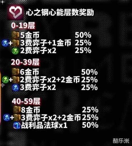1、心能0—59层:金币、弈子、战利品法球等奖励,概率如下: