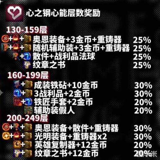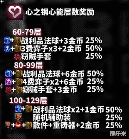 2、心能60—129层:法球、装备、辅助装等奖励,概率如下: