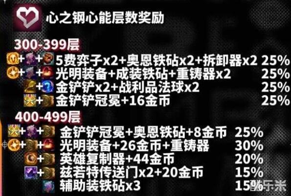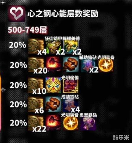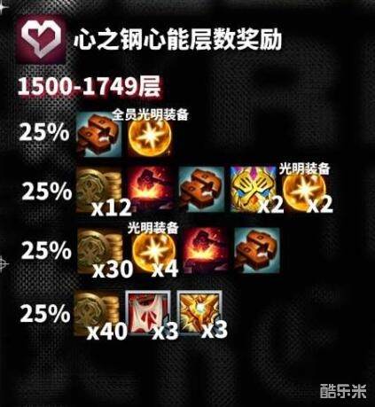 5、心能500层—749层:金币、成装、光明装备、成装铁砧、奥恩铁砧等装备。