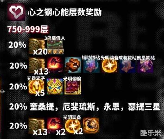 6、心能750—999层:金币,铁砧、光明装备、五费弈子、复制器等道具;