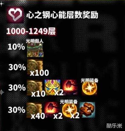 7、心能1000-1249层:金币、金铲铲冠冕、光明装备、光明假人等奖励。