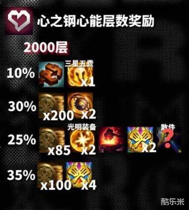 10、心能2000层:三星五费卡、光明装备、大量金币、金铲铲冠冕等。