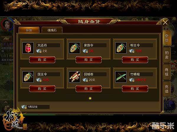 《征途手机版》随身商店中,随身杂货售卖各种功能性道具,主要分为杂货和魂魄石两类。杂货中有可让玩家角色快速回复血量的大还丹,有可让玩家创建家族的家族令,可让玩家创建帮派的帮主令等,不同杂货售价不同。魂魄石专区内,售卖各种各样的魂魄石,但这些魂魄石等级都偏低,但至少也能让玩家角色战力能快速提升。