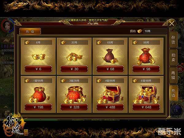 《征途手机版》中,想要获得黄金,除了一些特殊的福利赠送外,玩家还可以直接进行充值。想要充值时,打开随身商店选择充值页面,就可以选择自己想要的黄金充值数,可以用两来计算,也可以用锭来计算,想要多少就可以自行选择多少。