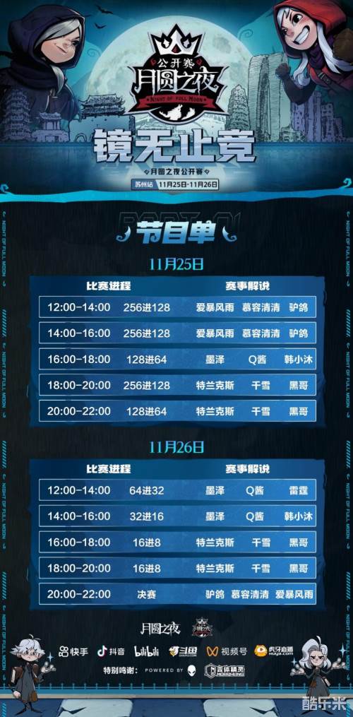 作为首届《月圆之夜》公开赛,千雪、特兰克斯、天才阿司、抖音丶黑哥、AlanC86、Xhope、b站墨泽、Q酱、夕尘残枫、驴鸽、慕容清清、OmegaZero丶等明星选手、主播、解说将共同参与比赛一起为大家带来精彩表演,群英荟萃,星光熠熠,谁将问鼎夺魁,拭目以待!
