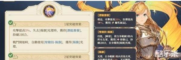 后期角色突破之后还可以招呼出来旗帜,这样带来的效果就是可以跟上面的潜能激发共同使用的,这样既可以提升攻击以及防御上面的数值,也可以得到免疫的属性,而且在一些小地图上面进行战斗的时候其实这个技能的效果就是非常实用的。