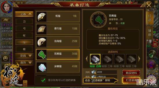 玩家可以打造31级以后的装备,每件装备都有不同的等级才能穿戴,每10级就能更换一次,比如玩家打造了31级生铁靴,下一等级的鞋子是41级的乘风靴。4块三等原材料可打造一件黄色装备,2块四等原材料可以打造一件绿色装备,细分化等级随机。