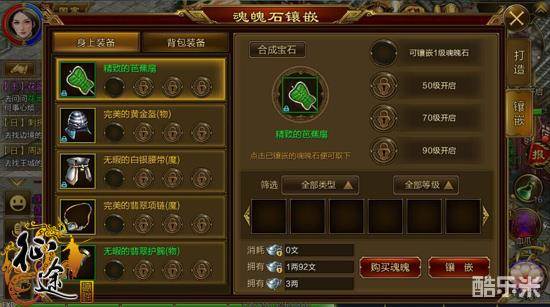 30级蓝色档次以上的装备上有4个凹槽,前期只开放第一个凹槽,后面3个凹槽分别要到角色50级、70级、90级才能开启,凹槽中可以插入魂魄石,提升角色属性。需要前往王城装备锻造师(285,180)处,并且背包里有魂魄石才能镶嵌。