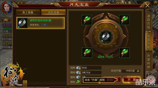 装备升星需要在越光宝盒中消耗升级宝石进行升星,在装备升星界面选中想要升星的装备,放入升级宝石即可升星,也可以选择自动升星,只要背包里的升级宝石足够多,可以一下子冲到15星。值得一提的是,并不是每次升星都要消耗4颗升级宝石,如果少放了升级宝石,也可以升级,只是成功率会下降,偶尔也可以赌一把运气。