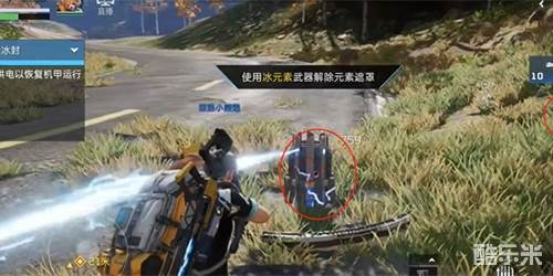 1、玩家把武器换成冰元素,随后用冰元素武器把发电装置解开,再解开两个传电器。