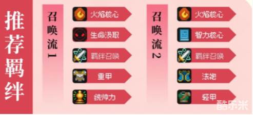 1、召唤流1:火焰核心、生命汲取、羁绊召唤、重甲、统帅力。