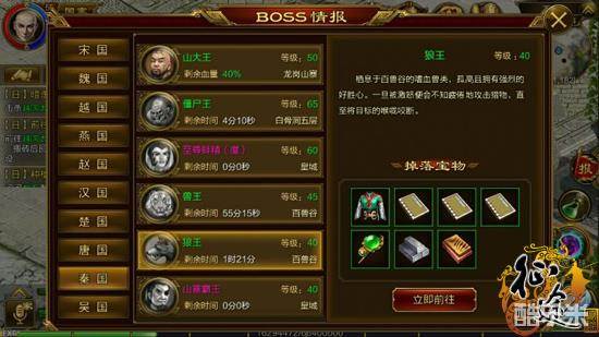 首先BOSS刷新均会有提示,在主界面点击BOSS按钮就能查看每个国家每个BOSS的状态,点击“立即前往”就能自动寻路到BOSS复活地点。为了获得更多道具,玩家需要在狼王刷新前,提前到达百兽谷集合,防止BOSS归属他人或其他国家玩家争抢。