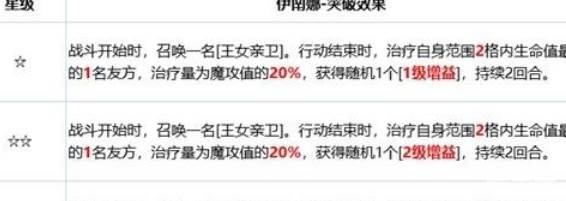 解析:战斗开始时,召唤一名[王女亲卫],王女亲卫可以用来卡位挡刀或者引怪行动结束时,治疗自身一定范围内生命值最低的友方,并施加BUFF。
