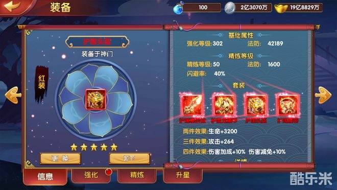 装备4件装备可以激活装备套装属性,获得套装装备效果,并且装备以及法宝可以通过强化、精炼以及升星来提升,只需点击需要培养的装备即可进入装备升级界面。