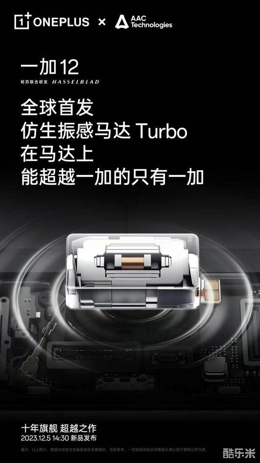 12 月 1 日,一加官宣一加 12 将全球首发与瑞声科技联合研发的仿生振感马达Turbo。这颗仿生振感马达 Turbo 拥有面向未来的马达性能、回归真实的马达体验和持续扩展的适配生态,在振动量、频宽、响应速度、振动丰富度等多维度全面超越 iPhone,马达体验再领先行业一年。