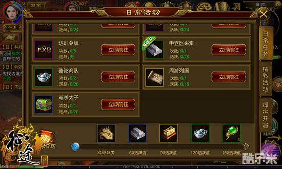 日常活动中有各种日常任务,中立区采集可以获得硬皮、秘银,周游列国奖励藏宝图有几率挖到硬皮、秘银,暗杀太子则可获得魂魄石,BOSS猎杀可获得秘银、硬皮、升级宝石。日常任务奖励的宝箱开启也有概率获得硬皮、秘银、魂魄石。完成日常任务会增加活跃度,达到一定活跃度即可领取秘银、硬皮、魂魄石、升级宝石奖励,日常任务每天一定要完成。