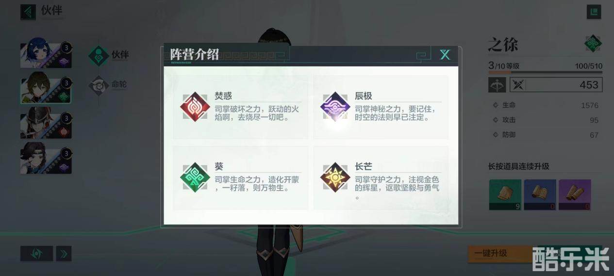 与玩家一同参战的角色主要有四个阵营:司掌火焰破坏之力的焚惑,司掌时空法则的辰极,司掌生命之力的葵以及司掌守护之力的长芒。不同阵营构成的小队,也会产生不同的“羁绊”效果为小队的战斗力提供不同的加成。