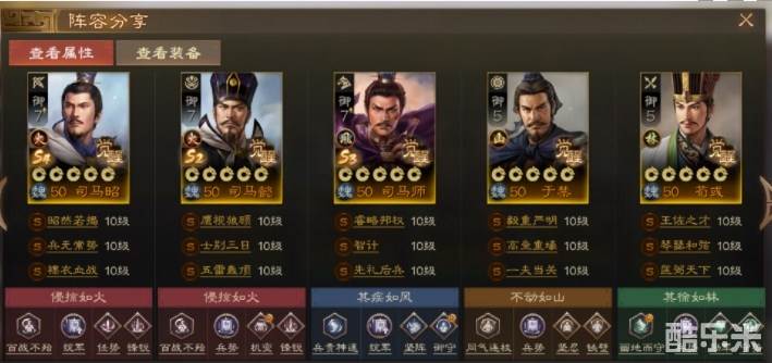 推荐携带【士别三日】+【五雷轰顶】。标配,能让司马懿在每2个回合都打出高谋略爆发;