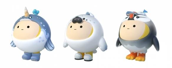 独角鲸普普(左)、竖琴海豹困困(中)、小海鹦兰兰(右)