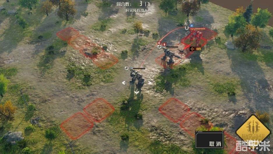 3、第三回合:击退兵移动至地雷边上,绳索兵将敌方拉到地雷上。