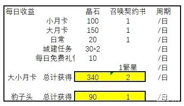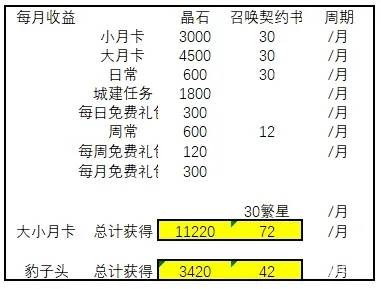 总结:大小月卡收益非常高,10连抽是1500晶石,一个月下来可获得72张召唤和30张繁星这里就=102抽=15300晶石。