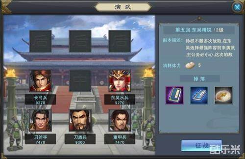 东吴演武稍微有点难度,适合中期阶段进行挑战,此时麾下人才济济,武将、兵种质量的优势慢慢凸显,兵种等级大致为3级,可以将武将技能发挥出最大效果。