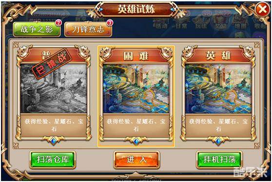 1、刀锋意志玩法同样分成3个难度:普通、困难、英雄;默认开启普通难度,52级以上玩家通关普通难度后开启困难难度,困难通关开启英雄难度。