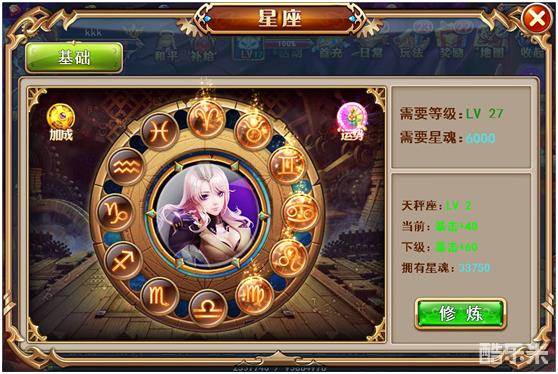 星座系统包括12星座,每个星座均对应一种属性,通过修炼星座,可获得属性加成:白羊座(气血)、金牛座(防御)、双子座(闪避)、巨蟹座(坚韧)、狮子座(攻击)、气血处女座(命中)、天秤座(暴击)、天蝎座(免伤)、射手座(穿透)、摩羯座(气血)、水瓶座(防御)、双鱼座(攻击),按顺序修炼星座,能全面增加战斗属性,大幅度提升自身战斗力!