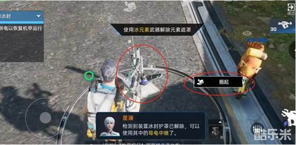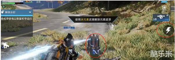 1、首先来到任务地点会发现发电装置被冻住了,接着玩家将武器切换成属性为冰元素的,給发电装置和两个传电器解冻。