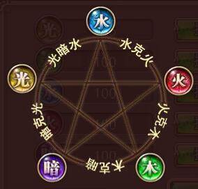 元素系统一共有5个元素属性,分别是:光、暗、水、火、木,他们之间存在着互相克制的关系: