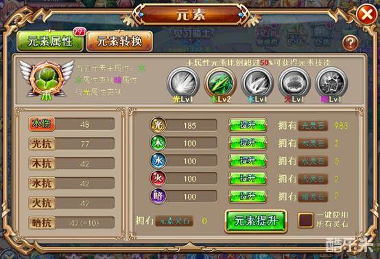 3)使用水、火、光、暗、木灵石可分别提升自身对应元素属性,每个灵石提升5点元素属性点,另外元素灵石可一次性提升5种元素属性各1点,元素属性提升后,会转换为相应的元素伤害和元素抗性,灵石可在元素之渊副本产出或在商城购买;