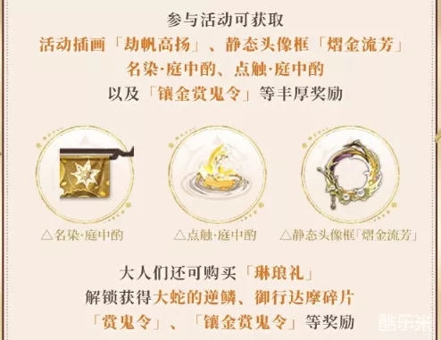 5、大人参与活动可获取活动插画「野望」、名染·庭中酌、点触·庭中酌、SR阶式神盗人神皮肤「野狩之牙」、动态头像框「熠金流芳·旗舞」、御行达摩、SP/SSR式神召唤券等奖励。
