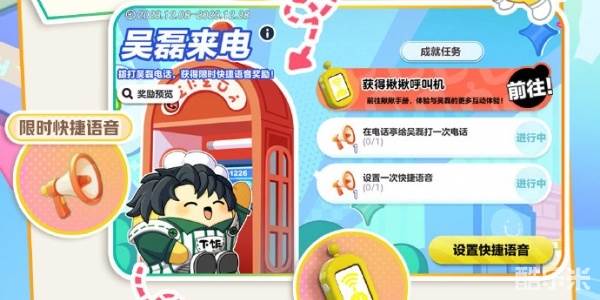 1、吴磊来电:在电话亭中拨打1226,完成任务后可以获得吴磊限时快捷语音。