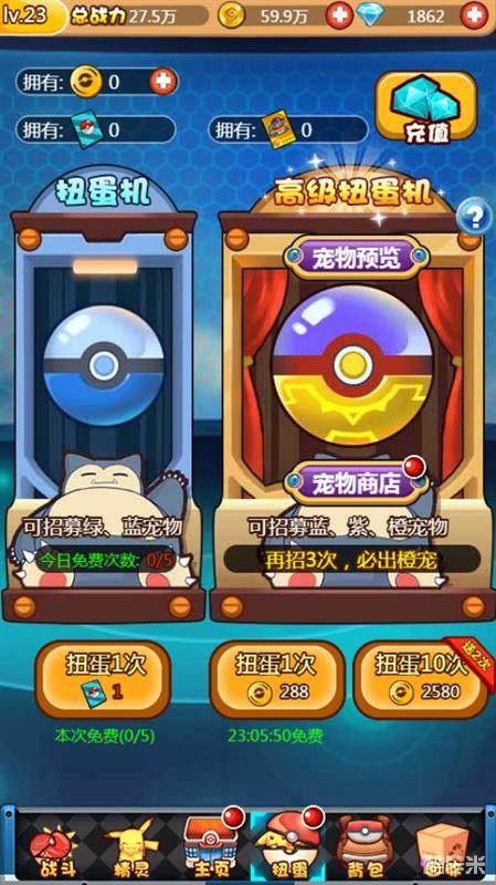 在玩《宝贝星球》这款手游的时候一定要记住一点,就是不能急,理性消费。因为游戏初期每日送你5次免费抽扭蛋的机会,和一次抽高级扭蛋的机会。也就是说系统固定会松了6只不确定品质的精灵。