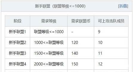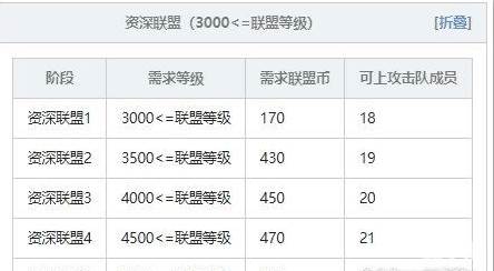 联盟级别是当联盟等级达到特定数值后提升的成长尺度。联盟级别越高,就可以在更广阔的战斗地图中配置更多的攻击队队员。联盟等级达到一定水平将要进阶,进阶需要支付一定联盟币。不同联盟等级提升所需要的要求也是有所不同,具体见下表(注:因为表格太长以拆封成多个表格)