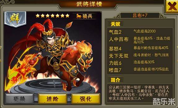 被动技能:战神,提高和减少来自武将的伤害。强化吕布的输出和抗打能力。