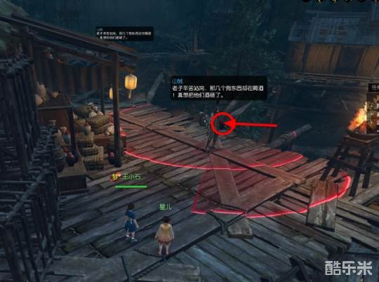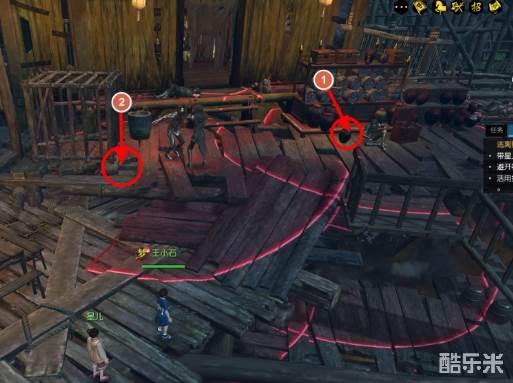 4.继续走,先用石头打碎酒坛,然后鼠标放在2号点木板的位置上,使用石头可以吸引这两个守卫。