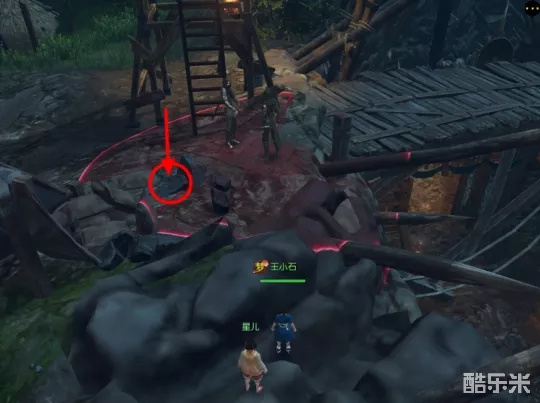 5.继续走,鼠标放在大石头后面的这个位置,使用石头可以吸引这两个守卫。