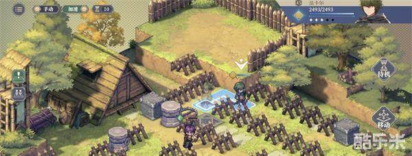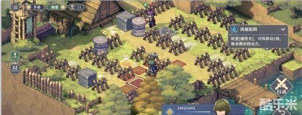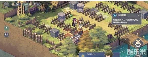 4.第四回合:向左下方移动一格,使用技能[蓄力跳跃]跳过栅栏,使用技能[诱捕陷阱]放置在左上方第二格处,用剩余行动力移动到箭头标识地面待机获得一个诱捕陷阱。