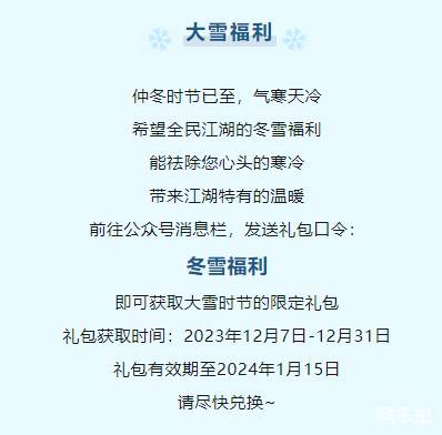 >礼包获取方式:【全民江湖丸子官方版】【全民江湖贪玩版】公众号消息对话框输入礼包口令:冬雪福利