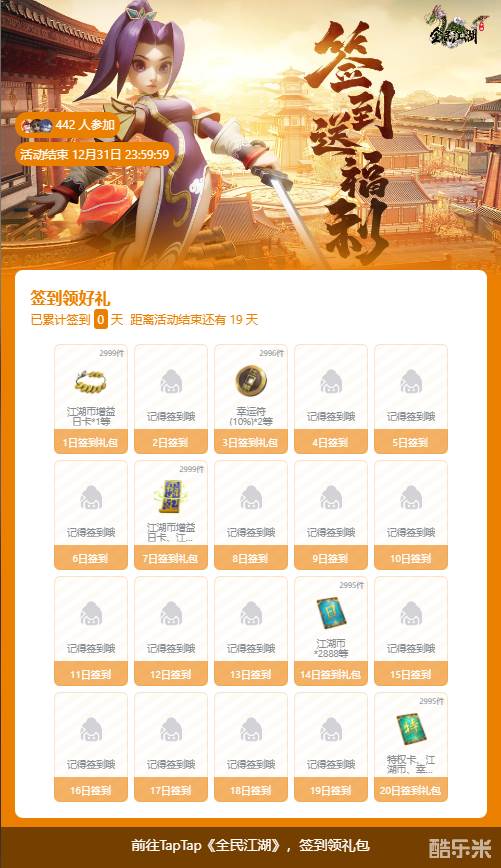 >礼包获取方式:前往TapTap软件搜索《全民江湖》,找到置顶签到活动帖子,点击立即签到,达成相应签到天数即可领取礼包。