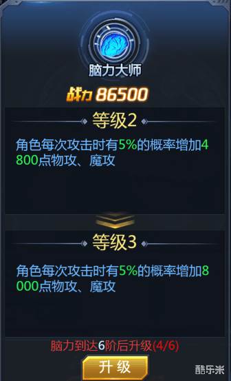 提升智慧到一定程度还能升级成为“脑力大师”,“脑力大师”是一个能够使角色每次攻击时有一定的概率增加物理攻击与魔法攻击的BUFF称号。BUFF效果会随着“脑力大师”的等级提高而提升。