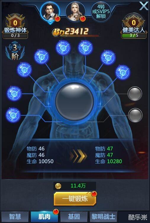 肌肉的提升比较容易,不需要用到复杂的材料,只需要使用金币即可锻炼提升。
