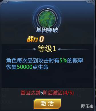 改造基因达到一定程度便可形成“基因突破”,“基因突破”后能够角色带来一个每次受到攻击有一定概率恢复生命值的BUFF。BUFF效果会随着“基因突破”的程度提高而提升。