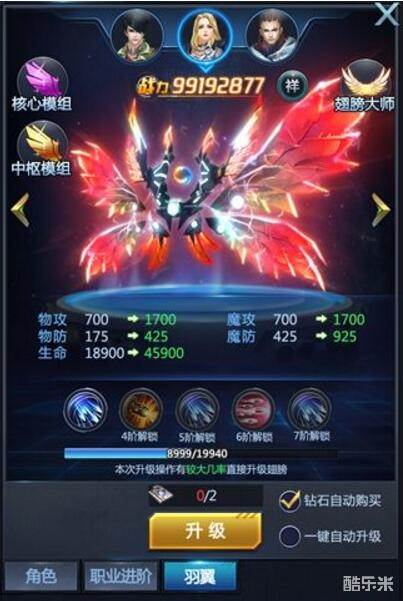 玩家可以通过核心模组进一步的提升羽翼。核心模组可通过节日活动获得产出的“核心模组”激活和升级,可提升翅膀的基础属性,核心模组的最高级数可根据翅膀等级的不断提高而提高。