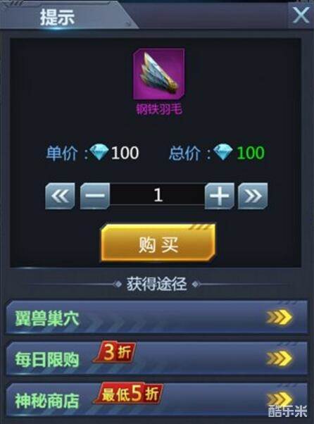 在每日限购、神秘商店、道具商店都可以购买到钢铁羽毛。在这里给你们一个小tip:在每日限购购买!有机会获得低至三折的材料,3折呢!性价比极高!