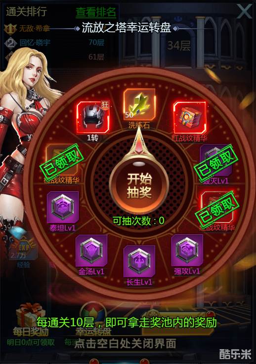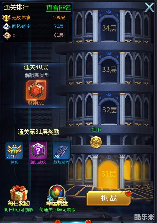 战力的提升离不开战纹的获取与升级,那么战纹在哪里获得呢?没错,就是流放之塔!流放之塔闯关,每闯过10层就会有一次抽奖奖励,抽奖也是获取战纹的重要途径。战纹格子的数量也与流放之塔相关,流放之塔的层数越高,开放的战纹格子越多。等打到70层,角色就可以开启4个格子,如果你拥有3个角色就相当于能够镶嵌12个战纹,战斗力十分可观。