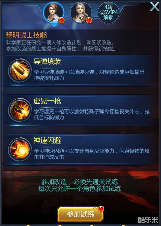 2转之后就能够开放黎明战士,开启黎明战士后能够拥有活体实验室的资源哦!比别人多一天进入实验室,就比别人多一分优势呢。成为黎明战士后带能拥有强大的黎明战士技能。能够快速提高战力和伤害。
