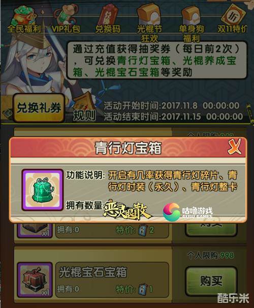 在双十一光棍节活动期间,玩家凭借【礼券】可在“光棍节狂欢”界面选择兑换三种限时宝箱。